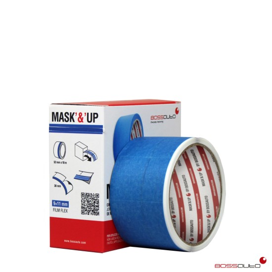 Cinta levanta-gomas para uso en carrocerías con precorte cada 38 mm. El producto se compone de una cinta de papel con adhesivo de base solvente según las características adjuntas, y una tira de film de poliéster flexible de 190 my de 9 + 11 mm de ancho por 10 m de largo, acoplada en uno de los laterales de la cinta de papel. Las características de la cinta levanta-gomas permiten que soporte temperaturas de hasta 80ºC y no deja residuo una vez acabada la aplicación.